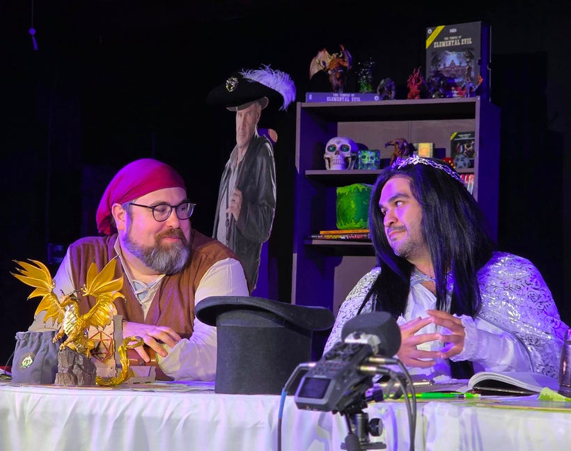 Dice Stage Right stars (from left to right) Matthew Melton, Evencio Bahena, Heather Lyon, and Hannah Jane Austin! Dungeon Master Jorphdan and ‘Wizard on the Soundboard’ Alexander Kirk!